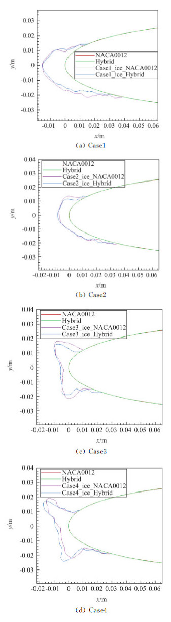 Case1和Case2状态下,两个翼型表面的冰形在前缘厚度和冰形面积上的差异均在20%以内,平均差异在10%以内;Case3和Case4状态下,混合翼型与原始翼型表面的冰形在上下冰角的高度和角度差异均较小,大部分在10%以内。从结果上看,混合翼型在目标状态下均能较好的模拟原始翼型的结冰外形。