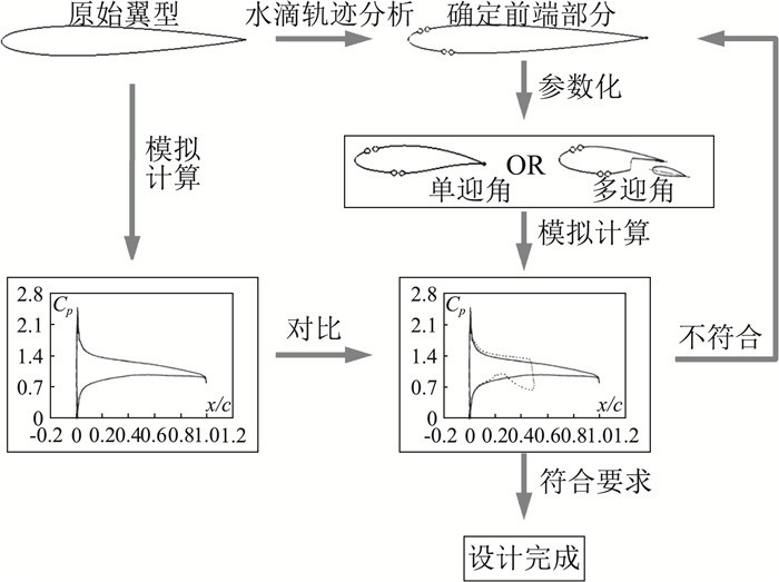 国内外在混合翼型设计方面都开展了较多的工作,Glahn[6]于1956年提出了混合翼型设计的雏形,其采用全尺寸模型弦长30%和50%的前缘,配合一个小尺寸的减阻后缘,组合形成了混合翼型,在冰风洞中对比了混合翼型和原始翼型的当地风速和当地水滴撞击率,认为在冰风洞中使用混合翼型是可行性的;1996年,Saeed[7-11]等在混合翼型基本原理基础上加入了设计概念,提出了混合翼型的设计方法:通过水滴轨迹的计算,以水滴撞击极限作为前缘不变范围,后缘设置多个控制点来拟合后缘曲线,以混合翼型尺寸、上下表面厚度、上下表面连接处的斜率以及曲线的连续性等参数作为约束,先后以前缘不变范围的当地速度分布一致性和表面水滴撞击特性的一致性作为判断标准,迭代控制点位置,获取满足要求的后缘曲线;国内赵克良和陆志良等[5]提出了一种基于前缘表面压力分布一致性的混合翼型设计方法,后缘设置控制点,利用多项式拟合,直接采用NS方程求解流场,以混合翼型与原始翼型前缘表面压力分布一致性作为判断标准,设计获取满足要求的后缘曲线,相较于以往基于位势理论的设计方法,设计效果能够得到显著提升。