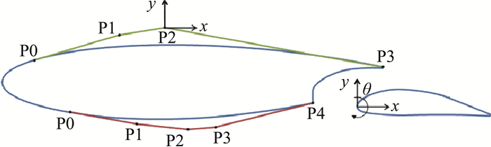 混合翼型的具体设计过程如图 2所示,首先对原始翼型进行流场计算和水滴轨迹计算,获得原始翼型不同迎角下的流场和水滴撞击极限,综合全迎角下最大的水滴撞击极限,作为前缘不变范围(以下简称为前端部分)。前端部分后方,主翼上翼面布置3个控制点,下翼面布置4个控制点,如图 3所示,参数化方法采用Bezier参数化方法,7个控制点xy坐标形成14个变量,但是为保证前缘P0处连续约束,P1点只单方向(与翼型曲线相切)运动,因此各少一个变量,剩余共12个变量,可控制调整主翼段几何外形,襟翼前缘点的xy坐标和襟翼偏转角度为襟翼的3个变量,主翼和襟翼共计15个变量,以不同迎角下前端部分的表面压力系数一致性作为目标,以基于代理模型的多目标遗传算法对15个变量值进行寻优选择,得到Parato最优解集,即为本次混合翼型的优化设计结果。