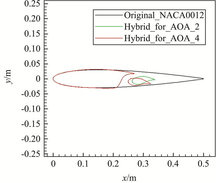 1) 混合翼型在不同迎角下均能够较好的模拟原始翼型表面的结冰外形,本文提出的混合模型设计方法是有效的;
