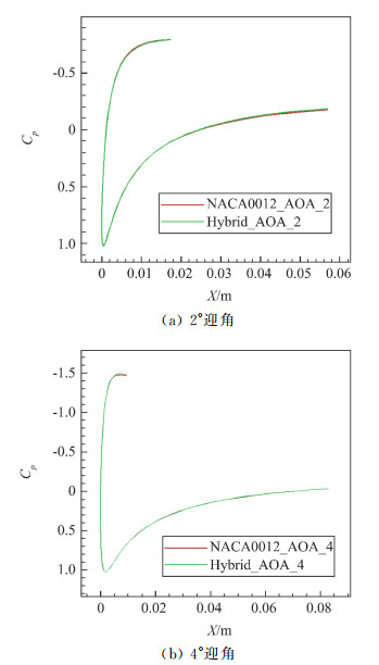 混合翼型与原始翼型的压力分布对比如图 6所示,两个迎角下的前缘部分压力分布曲线重合性较好,为进行定量展示,提取混合翼型和原始翼型在前端部分表面相同位置网格点处的压力系数,定义:
