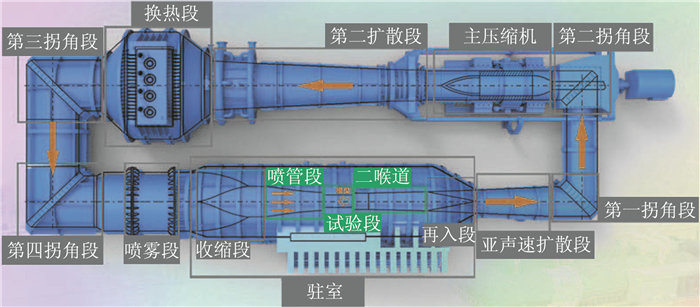 本次试验在航空工业空气动力研究院FL-61结冰风洞中完成,风洞结构如图 7所示,风洞试验段全长2.7 m,横截面尺寸为0.6 m×0.6 m。
