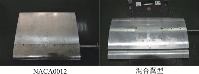 根据设计阶段的原始翼型和混合翼型弦长,结合风洞尺寸设计加工0.6 m展长的二元翼型模型,如图 8所示,试验模型在风洞中采用左右洞壁支撑的方式安装。