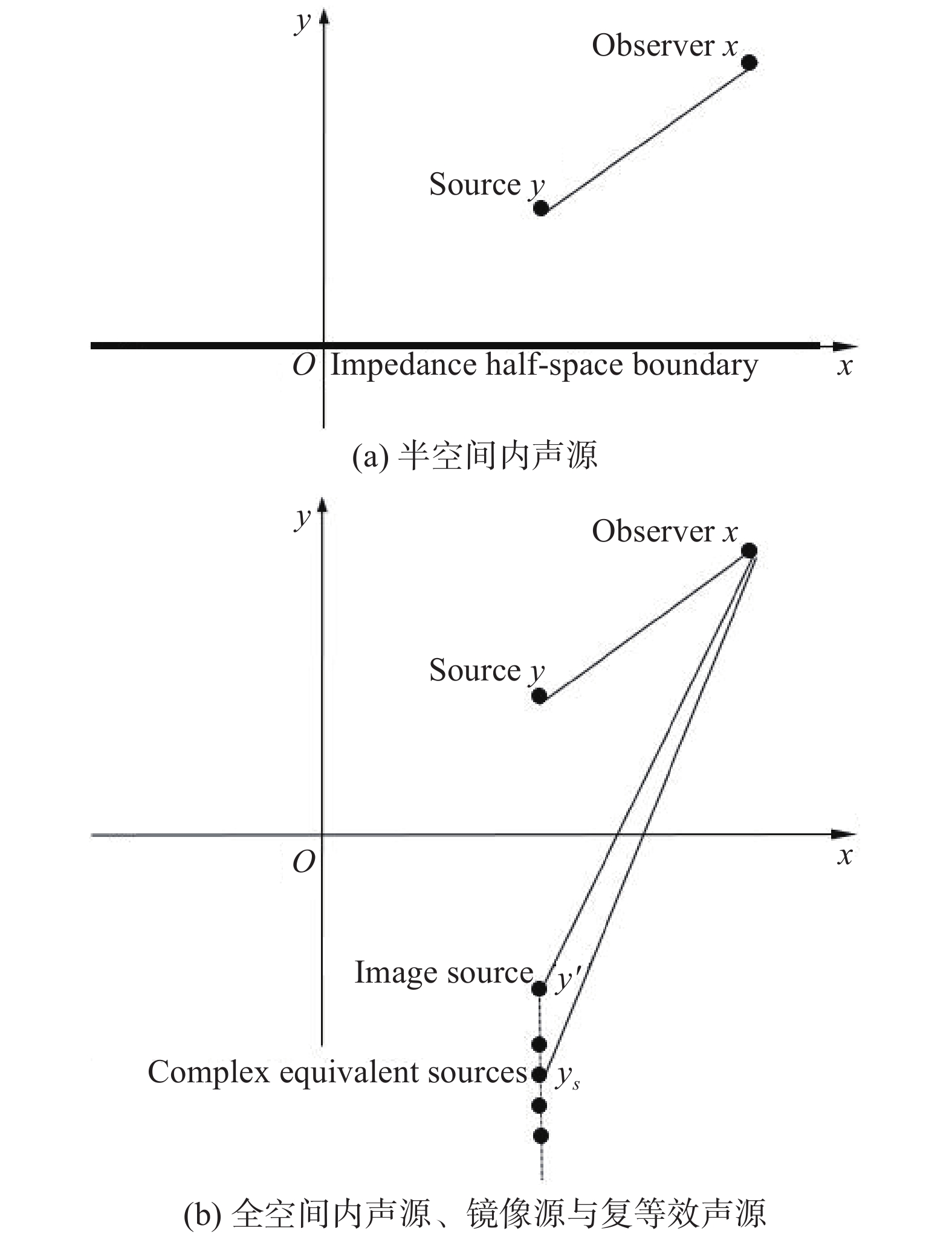 采用镜像源方法和复等效源原理考虑阻抗半空间边界的声散射问题,如图1(b)所示。镜像源和复等效源坐标分别为