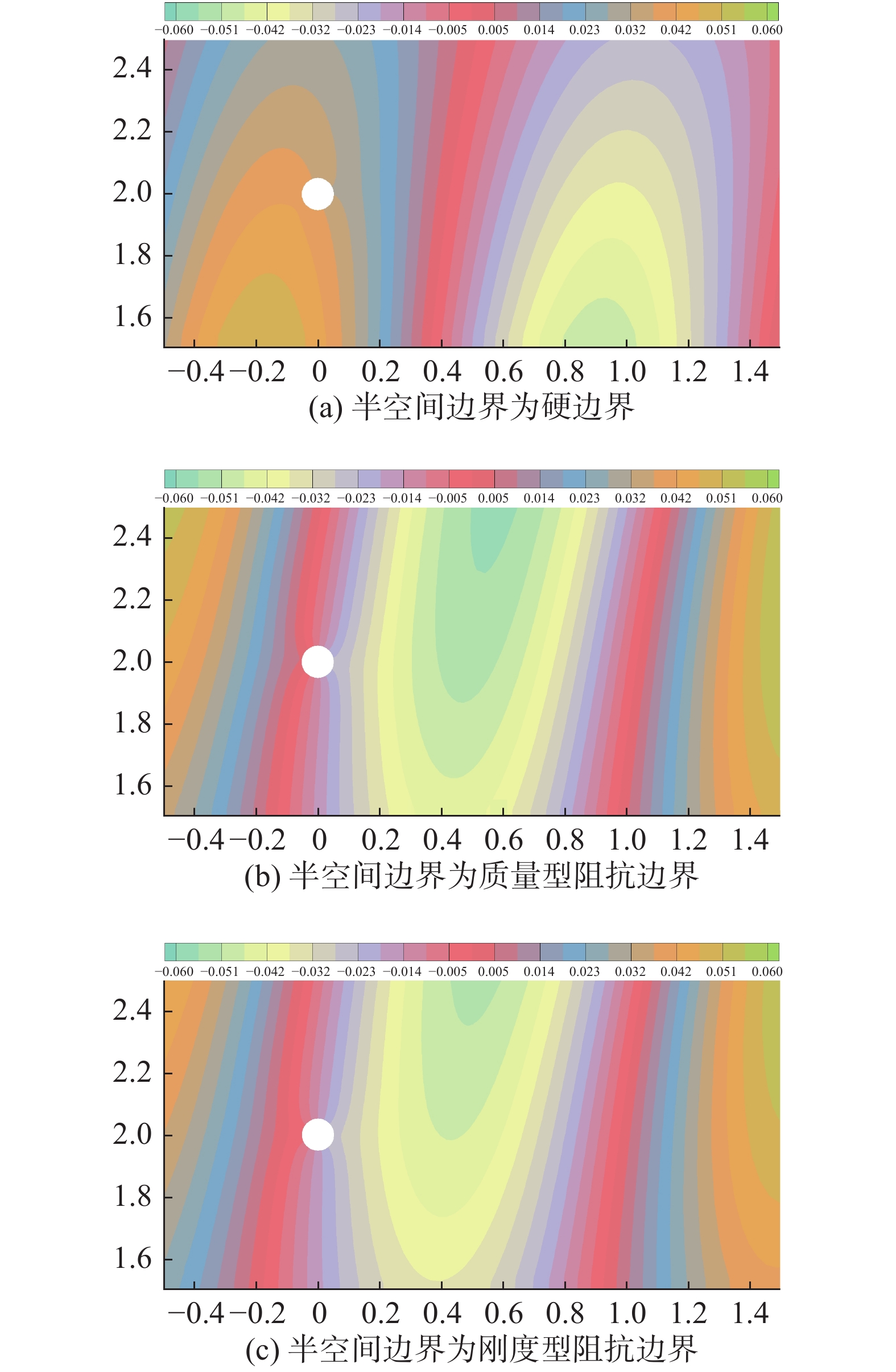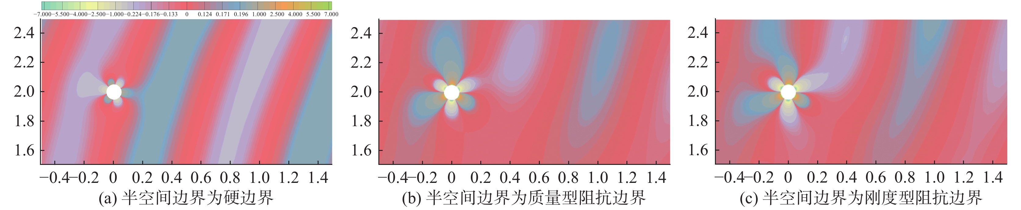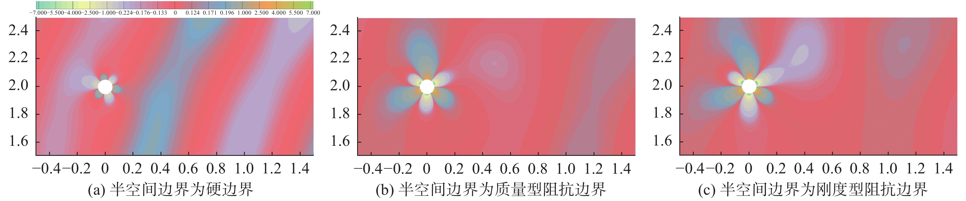 图11为半空间边界分别为声学硬边界、质量型和刚度型阻抗边界时,精确格林函数