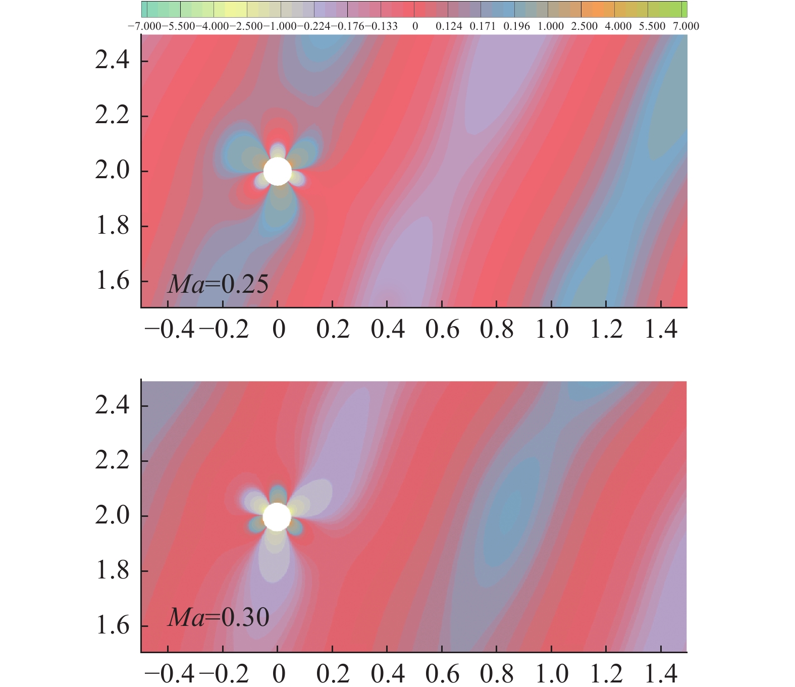 图13是半空间边界为声学硬边界且介质均匀运动马赫数为0.25和0.3时精确格林函数虚部空间二阶混合偏导数
