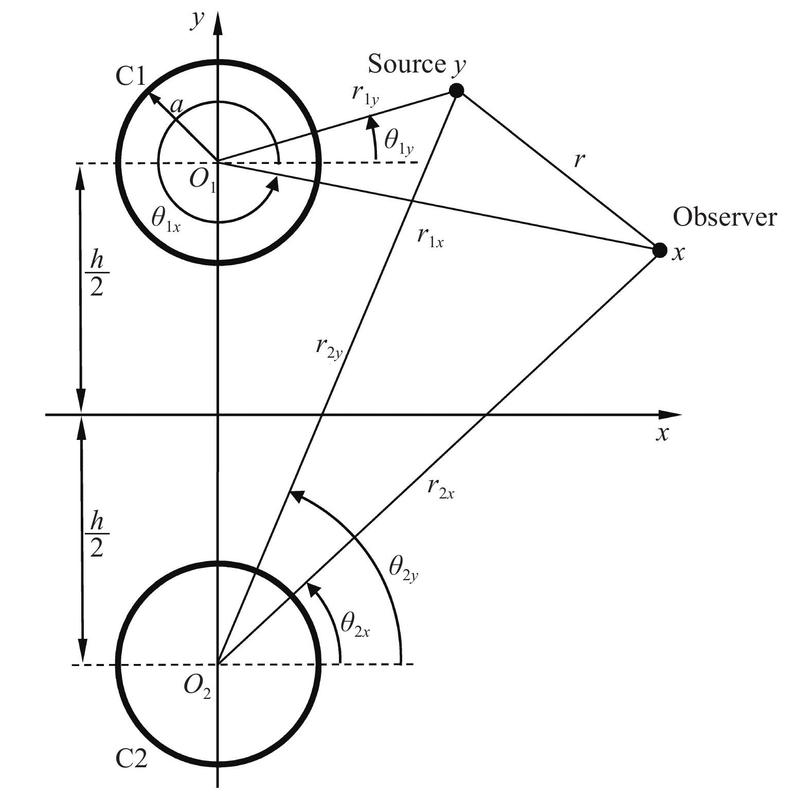 如图2所示,全空间中有两个半径为a的二维刚性圆柱C1和C2,圆心O1和分O2别位于x轴上下距离为h/2处,圆频率为