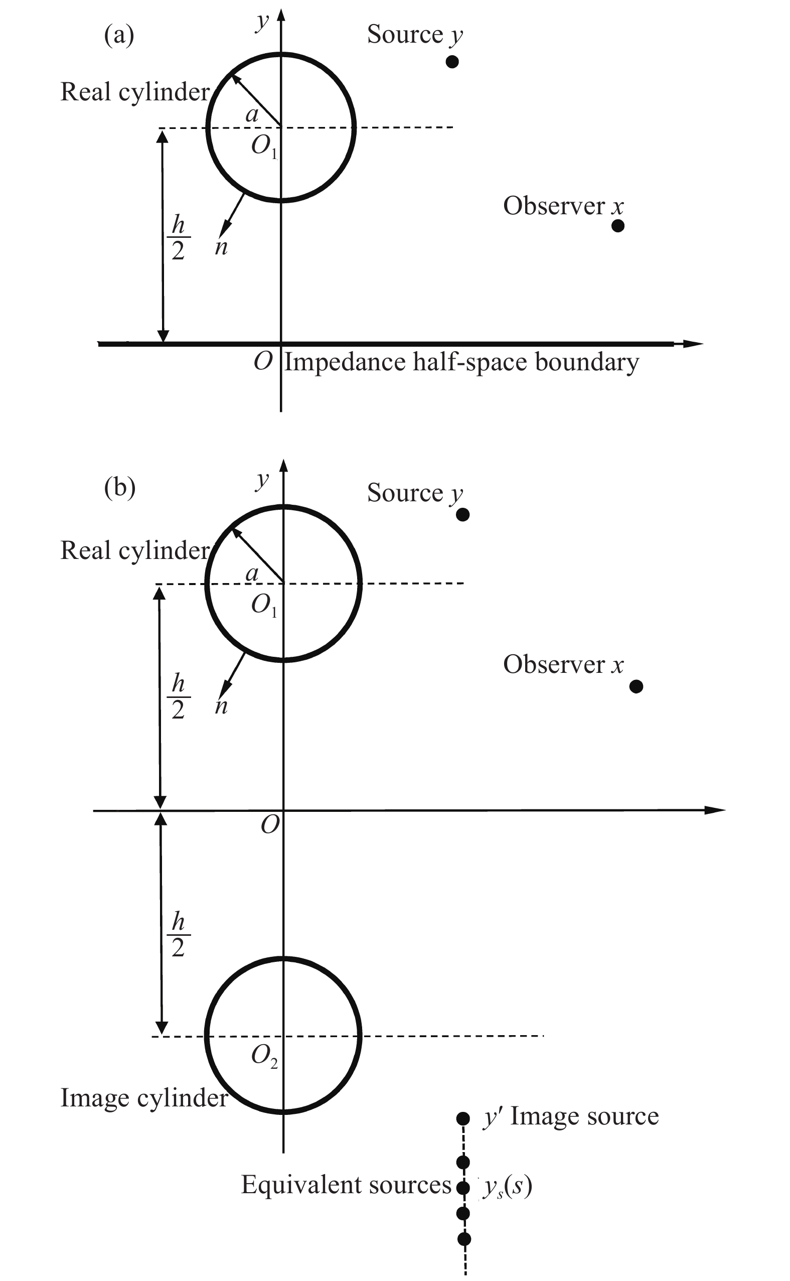 采用等效源方法将图3(a)所示的半空间圆柱声散射转化为图3(b)所示的全空间双圆柱声散射。对质量型阻抗半空间边界,镜像源和等效源坐标分别为