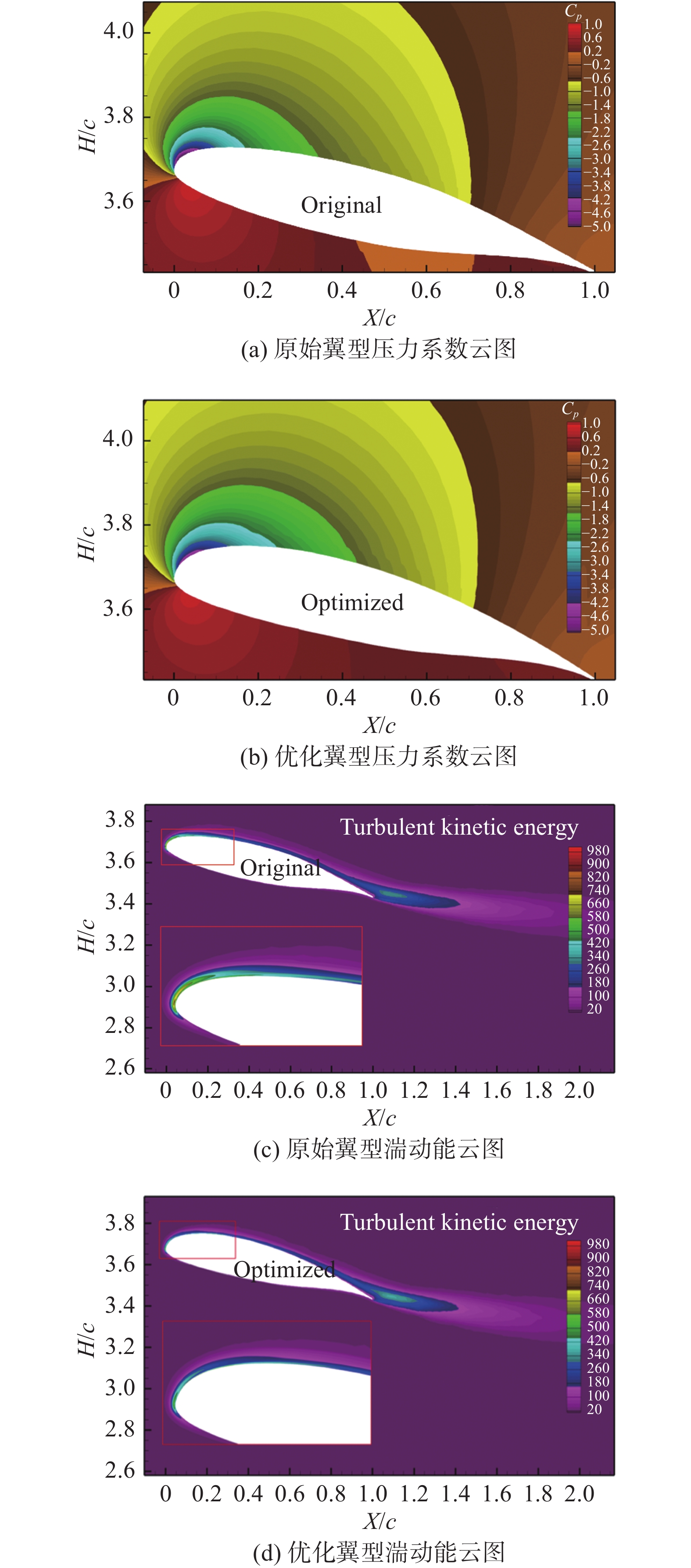图 15 优化前后翼型流场压力系数云图和湍动能云图对比 Fig.15 Comparison of pressure coefficient contours and turbulent kinetic energy contours of the airfoil before and after optimization |