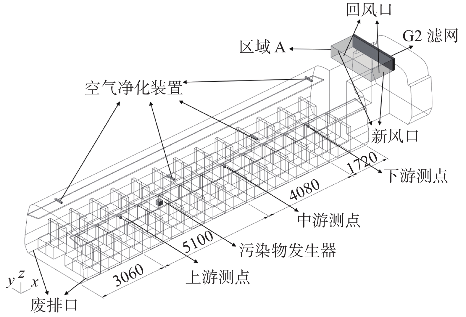 1 实验设置 1.1 实验环境本实验基于具有完整内部装饰、风道系统和全部空调功能的某型高速列车客室。该客室的风道结构对应的进出风方式为分散式送风、集中回风的通风结构,新风口位于新风/回风混合腔的两个侧面,回风口位于混合腔的底面,呈对称分布。客室共有13排座椅,每排5个座位,呈3+2模式分布,如图1所示。污染源由颗粒污染物发生器进行释放,释放的初始流量为0.004 m3/s,初始方向为图1中x方向的正向。释放的固态污染物粒径范围在1~100 μm之间。释放位置在客室流场的中游(如图1所示),以此代表列车中部过道位置附近乘客释放的污染物的扩散范围。经测量(CLIMOMATER6501),污染源在发生位置附近的温度为36°左右。考虑到污染源的释放速率和列车客室流场的空气体积,本研究不考虑污染源对客室流场温度的影响。此外,除了现役高速列车中常见的G2等级滤网之外,本研究还在客室内装天花板的4个代表性位置以及车内空调系统的新风/回风混合腔内(A区域)的两个代表性位置安装了基于介质阻挡放电技术的小型净化设备。并且在空调的混合腔内加装了可控制开启的基于静电除尘技术的空气净化滤网。客室结构和净化装置如图2所示。