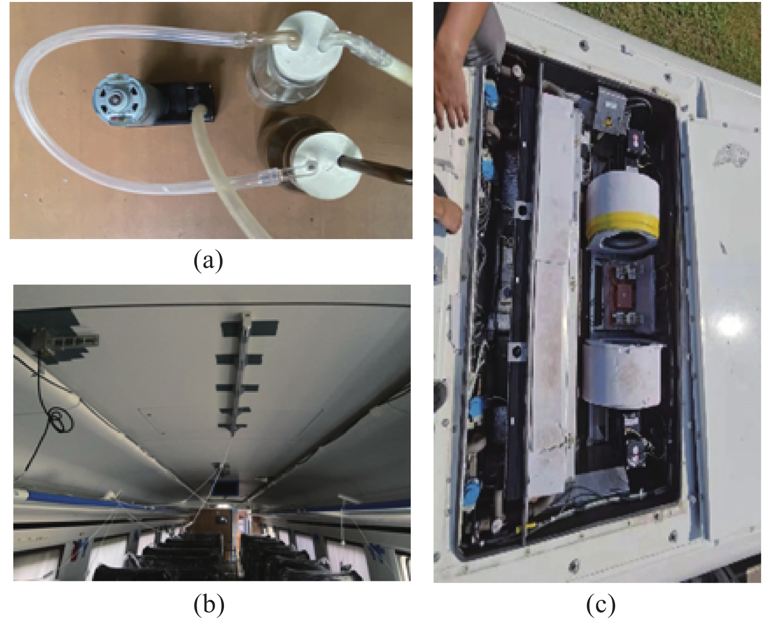 图 2 净化装置和客室结构布置图:(a)污染物发生装置;(b)介质阻挡放电装置代表性安装位置(图片左上方);(c)静电除尘装置安装位置(图中左侧滤网附近位置) Fig.2 Air purification unit and passenger cabin structure: (a) air pollutants generator; (b) typical installation location of the DBD unit (upper left of the picture); (c) installation location of the IFD unit (near the filter on the left of the picture) |
