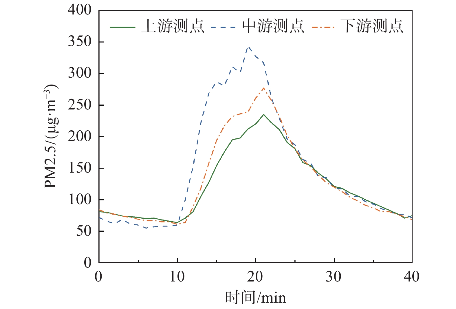 从图3中可以看出,实验最初十分钟,即污染物发生装置开启之前,客室的颗粒物浓度呈现小幅下降趋势,这是由于安装在空调系统中的G2滤网对空气起到了一定的净化作用。在污染物发生装置开启之后,中游测点由于受到列车客室内纵向流动的影响,其污染物浓度上升的速度明显高于其余两个测点,且PM2.5峰值浓度也高于次高的下游测点24.18 %。此外,下游测点的污染物浓度上升速度也明显高于上游测点,其峰值浓度高于上游测点17.87%。值得注意的是,虽然本研究通过热线风速仪对客室环境中的流速和流向的测试发现环境中存在0.6 m/s左右的持续纵向流动。但是图3中的实验结果表明,分布在上游测点和中游测点之间的污染物颗粒发生器产生的污染物同样能造成上游测点污染物浓度的显著提升。这种现象是由于客室内装结构和送风风道、回风风道和废排风道的导致的局部湍流效应造成了空气对流效应下空气污染物颗粒从下游向上游方向的传递。
