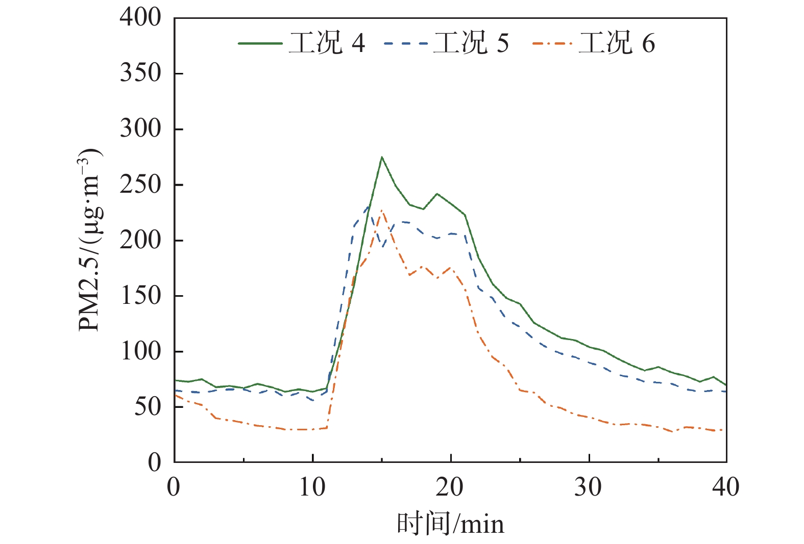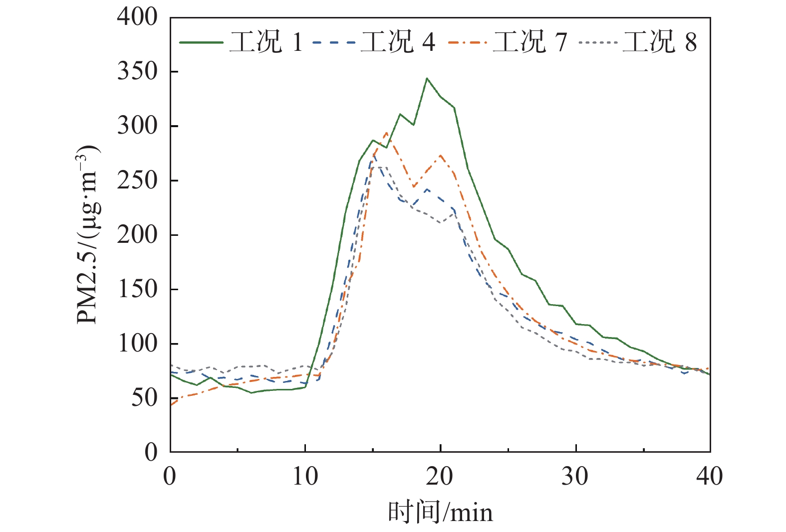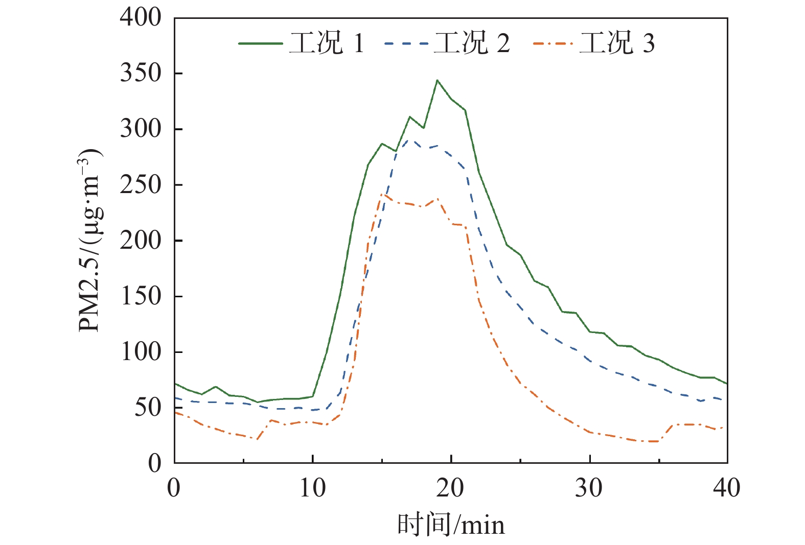 | 表 3 典型工况下污染物颗粒浓度峰值及达峰时刻 Table 3 Peak concentration and the time to peak of pollutant particle concentration for typical cases |