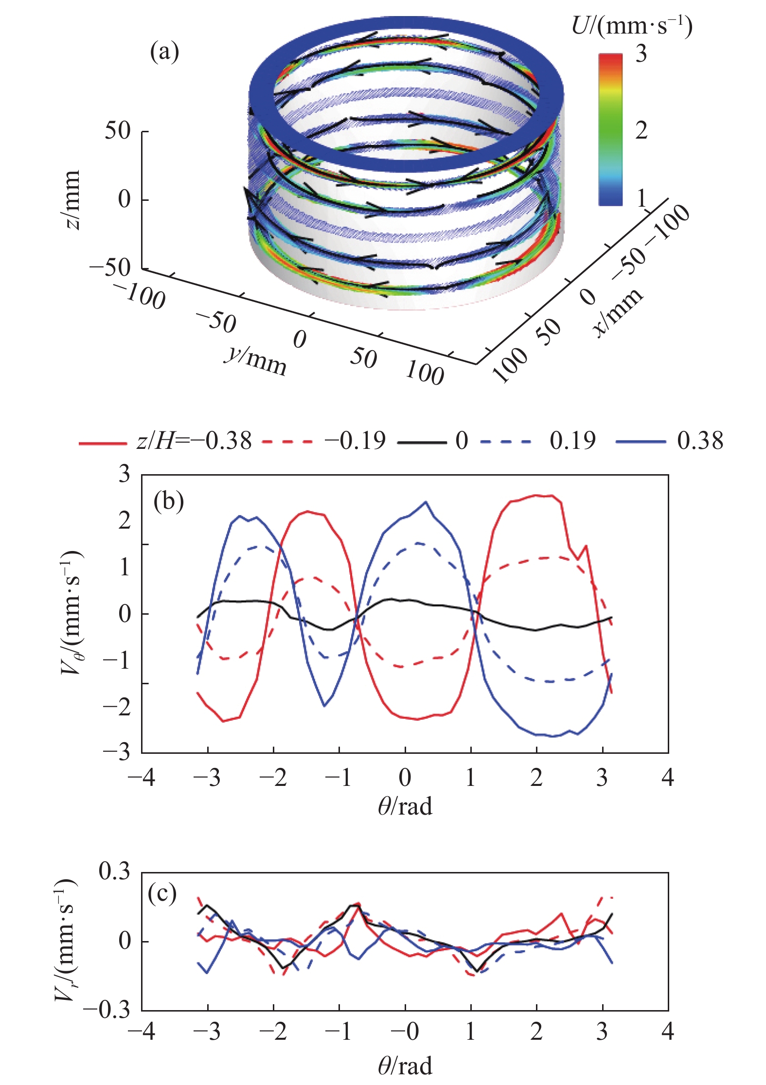 图 3 (a) 四极子流态时的均速度矢量图与部分流线 ;(b) 时均角向速度分布图;(c) 时均径向速度分布图 Fig.3 (a) Mean velocity field and streamlines of the quadrupole mode; (b) mean angular velocity; (c) mean radial velocity |