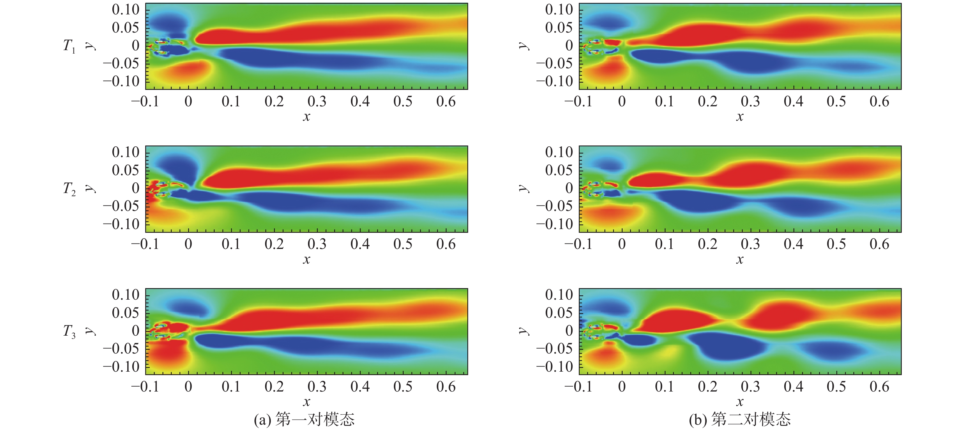 图14~图16分别展示了不对称转向架、对称转向架和无转向架三种转向架构型的第一对模态和第二对模态的涡量重构结果。从不对称转向架结果来看,对于第一对模态重构结果,可以看到从近尾迹区的交替涡脱落,向下游发展与流向向涡对相互作用后相融合;对于第二对模态重构结果,T1时刻尾迹的主要特征为正弦式震荡,而T3时刻为交替涡脱落,T2时刻则为二者的一个过渡。因此第一对模态表示交替的涡脱落特征,而第二对模态表示涡脱落与正弦式震荡交替出现的双稳态特征[10],故两对模态在模态图上差别不大。从对称转向架结果来看,如图15所示,相比不对称转向架,第一对模态重构结果的展向范围更窄;第二对模态的的涡脱落不明显,正弦式震荡也不如不对称转向架强烈。从无转向架结果来看,如图16所示,第一对模态的重构结果也能观察到涡脱落,但在近尾迹区较为混乱,与其他两种转向架差别较大,主要是由于空腔后缘流动分离产生的大尺度涡脱落造成的;第二对模态重构结果的涡脱落和正弦式震荡的强度均介于不对称转向架和对称转向架之间。