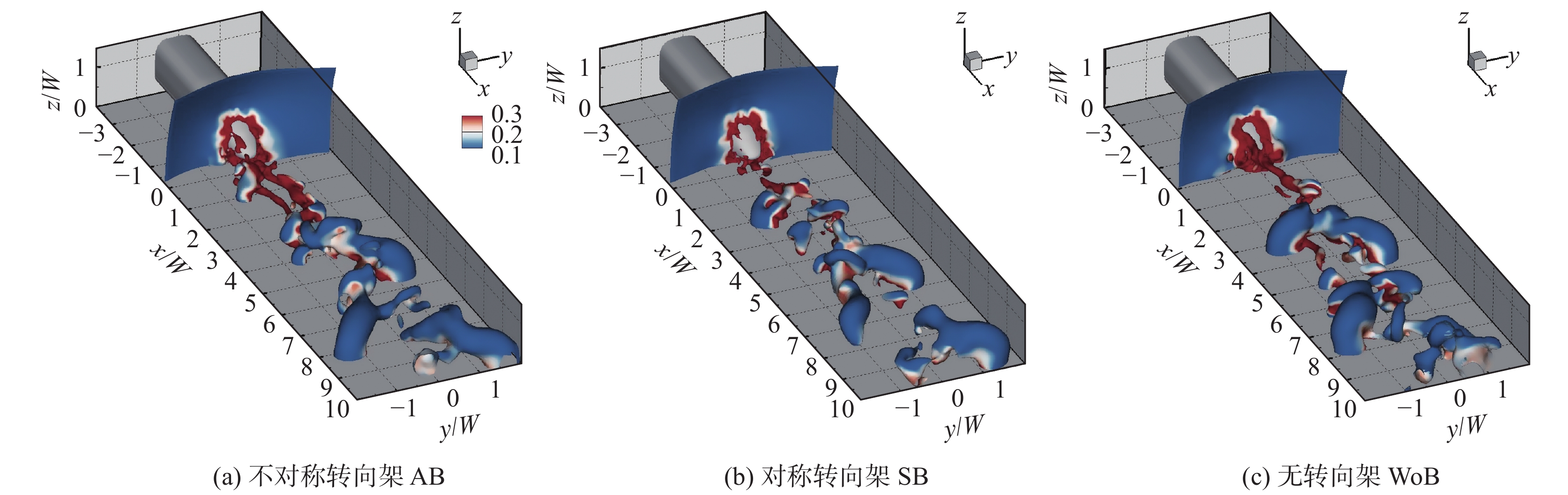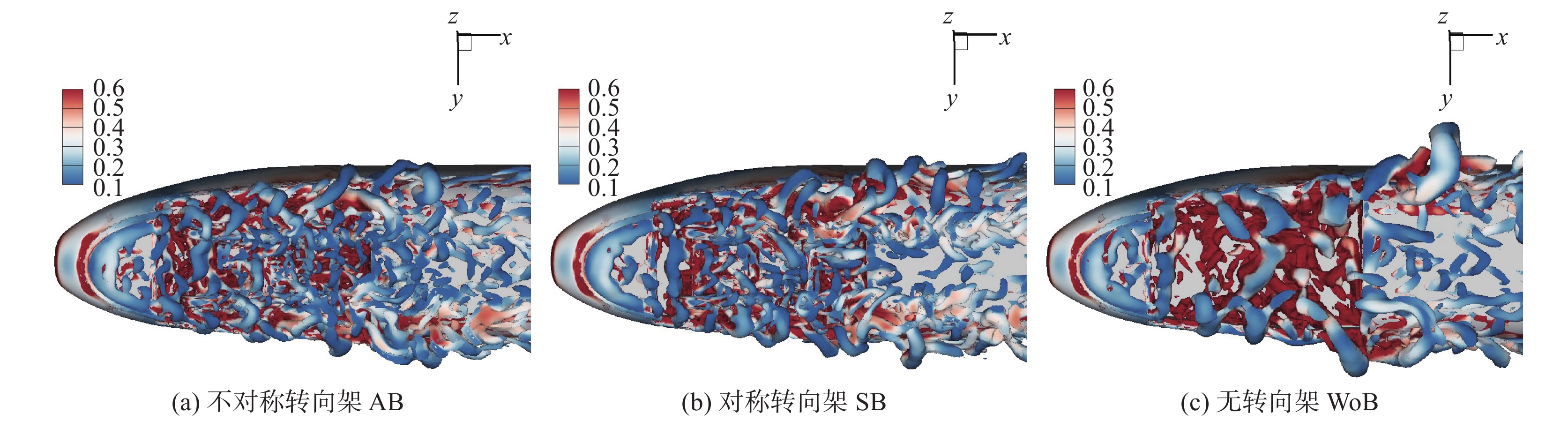 图8展示了Q准则中Q= 1000时的三种转向架构型的时均尾迹流场。由图可知,三种转向架的尾迹均是由一对反向旋转的流向涡主导;其中,无转向架和不对称转向架的涡结构强度更大,尾车底部两侧的涡脱落结构更加明显。