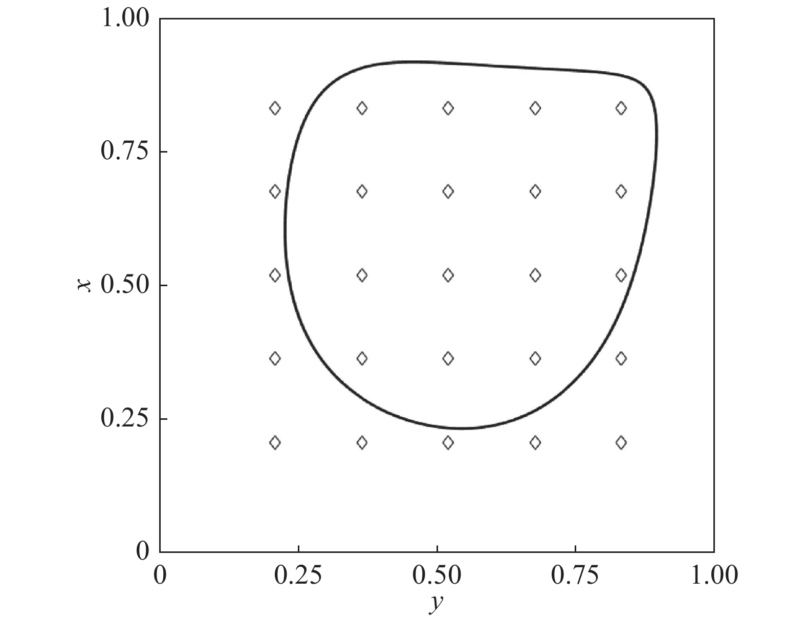 4 展向强受限的情形 4.1 初始位置的影响这一部分我们主要考虑了展向在强受限情况下初始位置对颗粒最终运动的影响。对于P1情况,雷诺数Re = 1000和半径R = 6的参数下,对应的斯托克斯数St = 0.868。颗粒在展向z = 0.5平面上的不同初始位置释放,我们模拟了25组算例,且颗粒的初始位置如图12中空心菱形所示,黑色实线表示最终的稳定轨迹。可以发现,颗粒的初始位置对最终的极限环轨迹没有影响。这与Hu[33,48]的结果一致,他在文章中指出,二维方腔中颗粒的极限环轨迹与长椭球颗粒的初始朝向和初始位置无关。