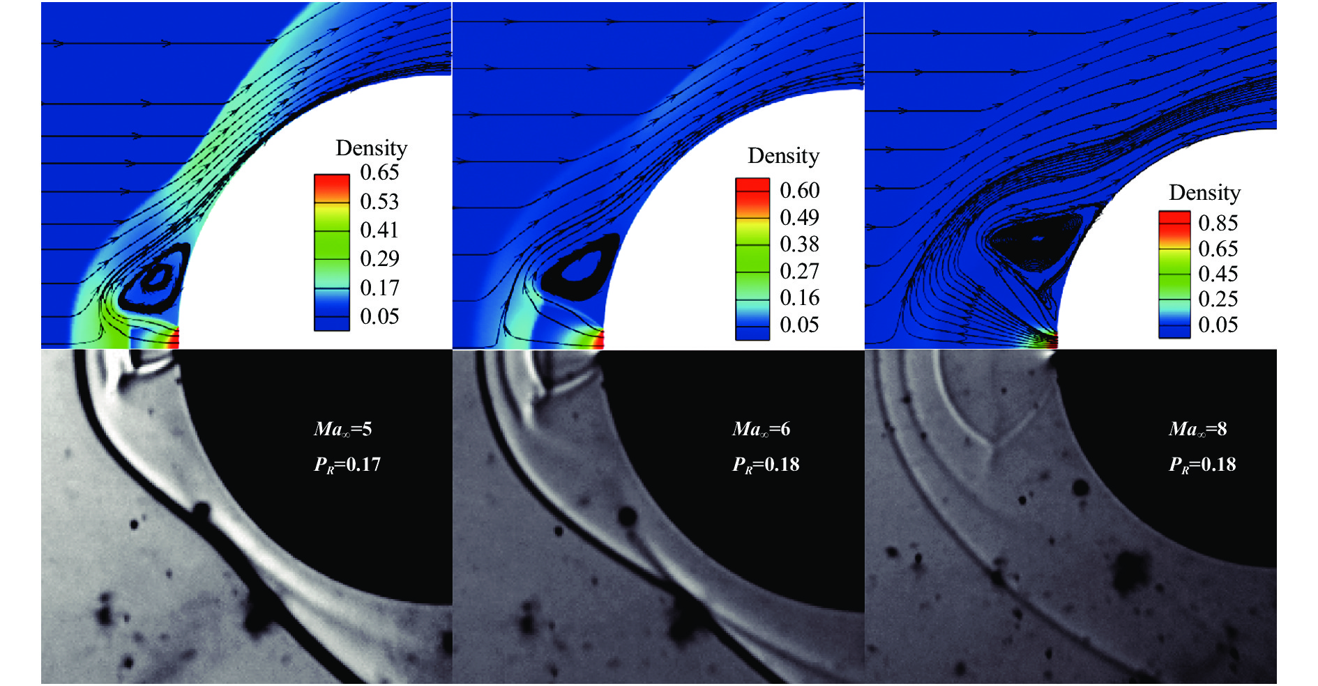 3 结果与分析 3.1 典型流场结果对比图9和图10给出了来流马赫数6条件下不同喷流压比(
