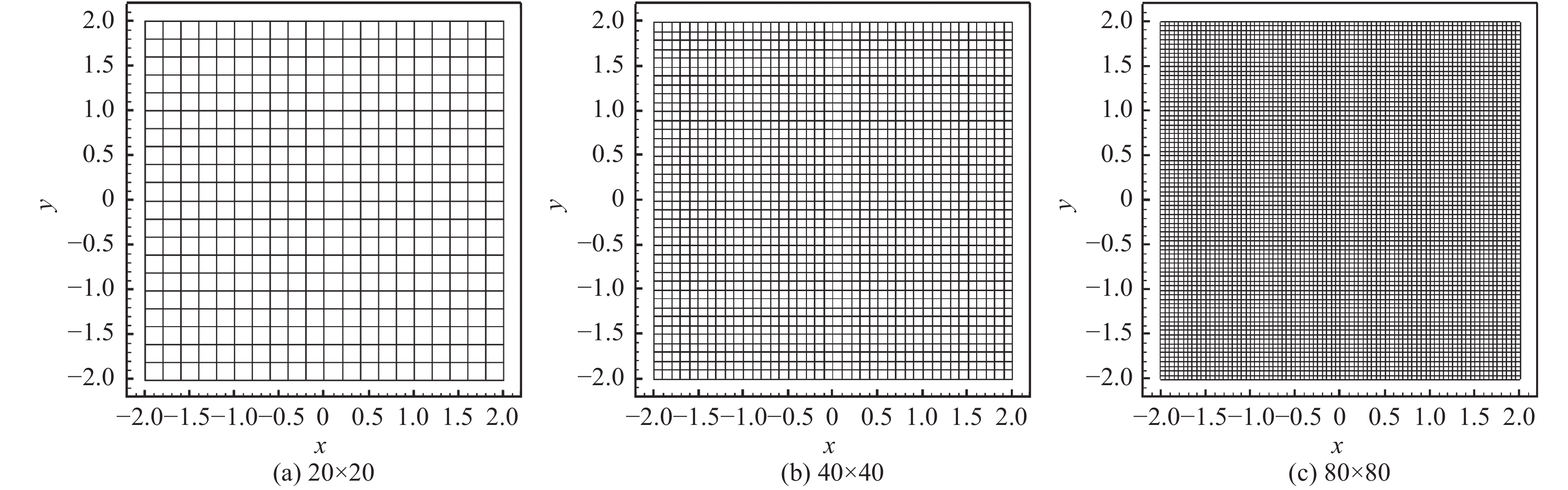 2.1 测试案例设计为测试不同核函数针对网格边界运动规律的拟合能力、计算效率以及不同疏密网格下的健壮性,设计如图2所示的三套不同密度的二维笛卡尔网格。这些网格x、y方向的坐标范围为[−2, 2],z方向坐标为0,网格单元数分别为