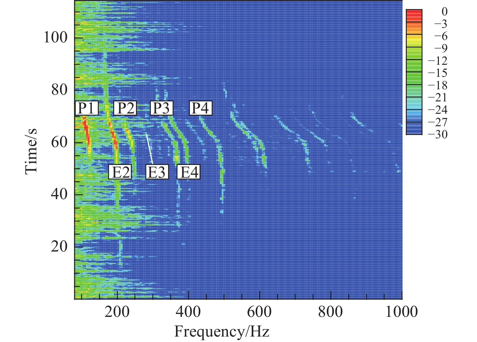 图10给出了起飞过程中无人机噪声的单麦克风频谱,图中“P1”、···、“P4”表示1~4阶螺旋桨噪声分量,“E2” 、···、“E4” 表示2~4阶螺旋桨驱动系统噪声分量。可以看到清晰的多普勒效应,表明麦克风信号正常,信噪比良好。无人机起飞过程中飞越阵列正上方时的高度为191.7 m,飞行速度为30 m/s。从图10中可以看到主要噪声分量呈现出了显著的多普勒效应。