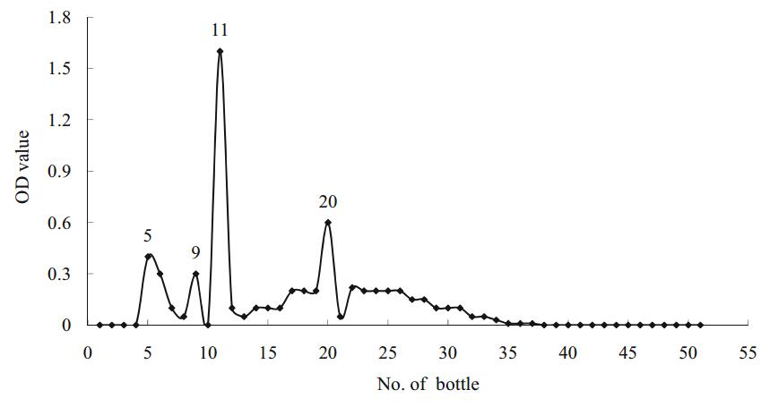 From the crude toxin cultured from mycelia, we collected 51 separate volumes that attained a maximum absorption at 276 nm during the entire elution time (4 days). The optical density of compound No.11 was the highest, whereas Nos. 5, 9 and 20 were in the mid-range. No substance was found above sample No. 38 (Fig. 1).