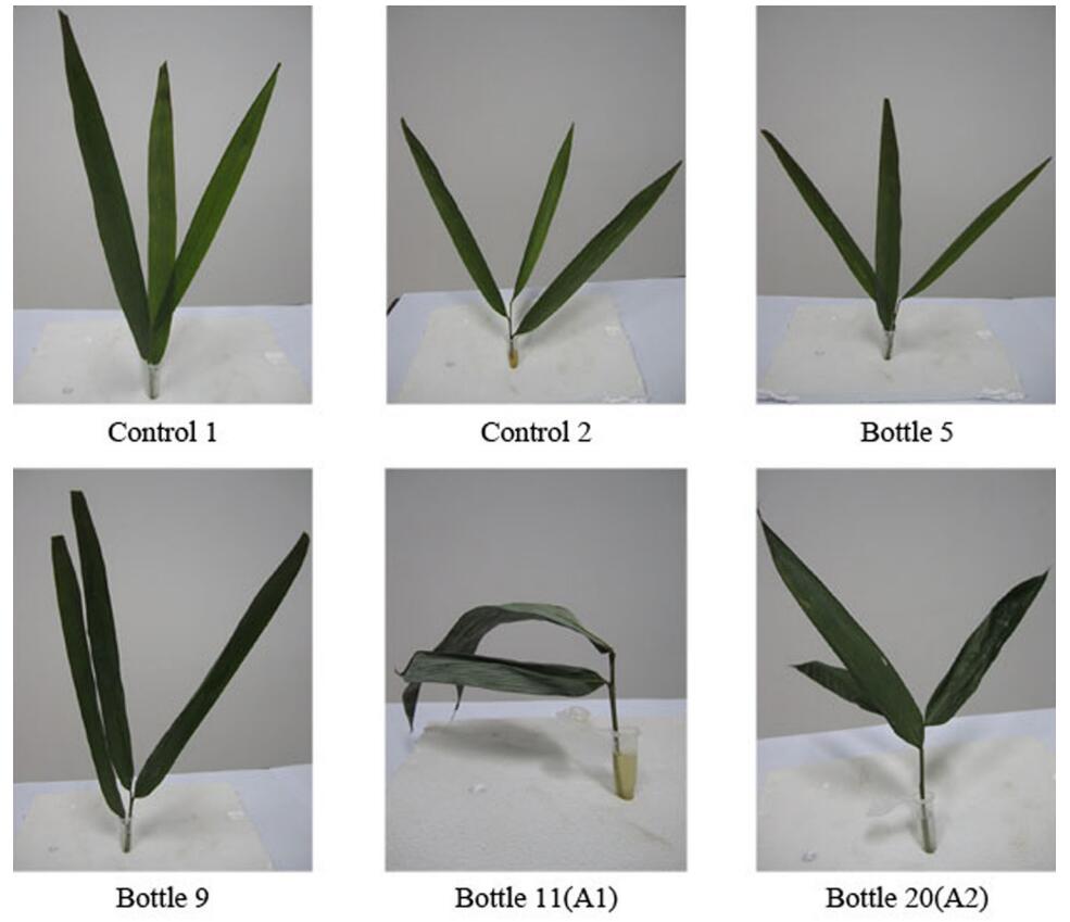 Fig. 3 Symptoms of hybrid bamboo infected by toxin. Control 1 sterile water; control 2 sterile Fries solution; bottle 5, 9, 11 and 20: the compounds isolated from A. phaeospermum |