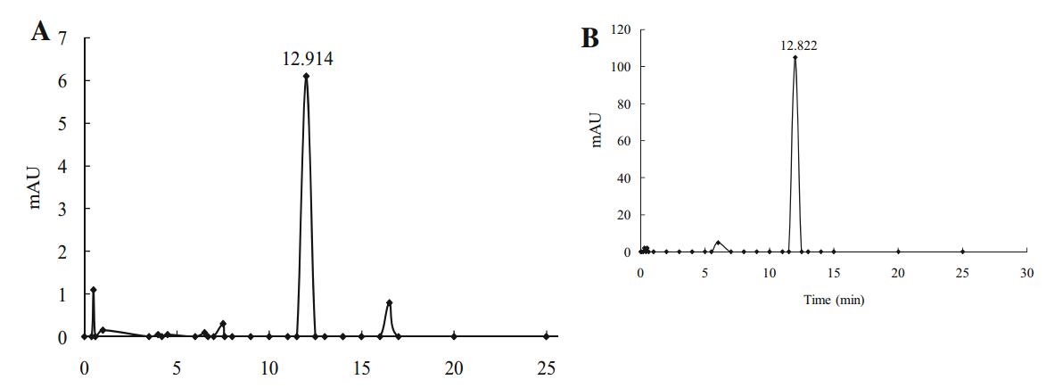 Fig. 4 HPLC on VP-ODS C18 5 lm reversed-phase capillary chromatography column (4.6 mm × 150 mm). a HPLC profiles of compound A1; the solid bar indicates the fraction containing toxicity at 12.914. b HPLC profiles of DBP standard; the solid bar indicates the fraction containing toxicity at 12.822 |