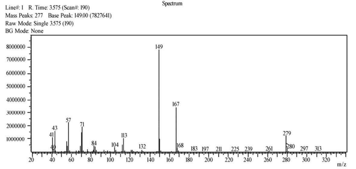 MS (Fig. 5) revealed the peaks of the cracking ions of carboxylate carbonyl carbon at m/z 43, 57, and 71, and phthalate base at m/z 149, which was considered for the characterisation of phthalate ester with lateral chains larger than two carbons. Considering an [M+H]+ ion peak at 279, the molecular weight of AP-Ⅰ was inferred to be 278.