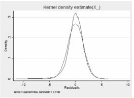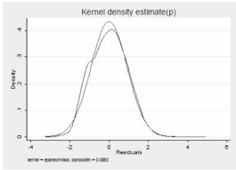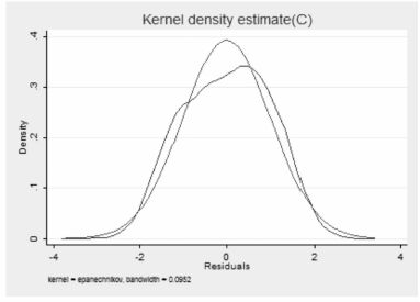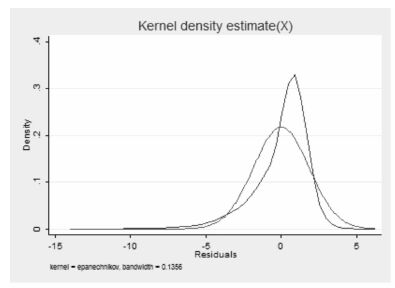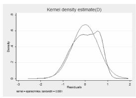 (五) 稳健性检验与内生性讨论 1. 分位数回归不管是前文基准回归所采用的混合最小二乘估计还是后文提及的面板固定效应回归,实质上都是均值回归,这就对Y|X的对称分布与残差项的正态独立同分布提出了极高要求。为此我们画出了在控制了省份、行业、年份固定效应后的残差分布图, 图 (1) 至图 (5) 依次是以lnXkjft、lnCkjft、lnPkjft、lnDkjft、lnXkjft为被解释变量的回归残差的分布图。为便于观察,我们在图中同时加入了正态分布示意图作为对比。总体上看,残差项基本呈现了正态分布,这意味着计量模型(2) 在大样本下发挥了较好特性,但是部分残差分布的偏斜不均还是需要谨慎处理。这里采用分位数回归检验基准回归的稳健性。