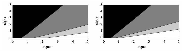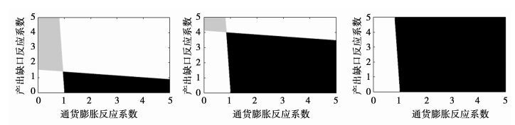 ① 图 2中左中右分别为σ等于0.7、2和4时的泰勒规则确定性和预期稳定性区域。其中,灰色+黑色为确定性区域,黑色为稳定性区域。
