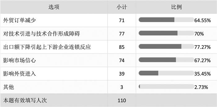 作为外贸大省,广东进出口贸易额占到全国的四分之一,因此,中美贸易摩擦对广东经济发展的影响可能比其他地区更为明显。表 11的调查结果显示,77.27%的学者认为中美贸易摩擦会导致广东企业总体出口量下降,并通过上下游企业连锁反应影响到相关行业产业链的运作。70%的学者高度关注中美贸易摩擦背后所隐藏的技术竞争,认为美国刻意挑起的贸易争端将对广东的技术引进与对外技术合作形成障碍。此外,影响市场信心(67.27%)和外贸订单减少(64.55%)也是学者们高度关注的负面影响。相较而言,认为中美贸易摩擦会影响外资进入的学者较少(35.45%),这表明中国作为全球最大的单一市场的优势是不可替代的。