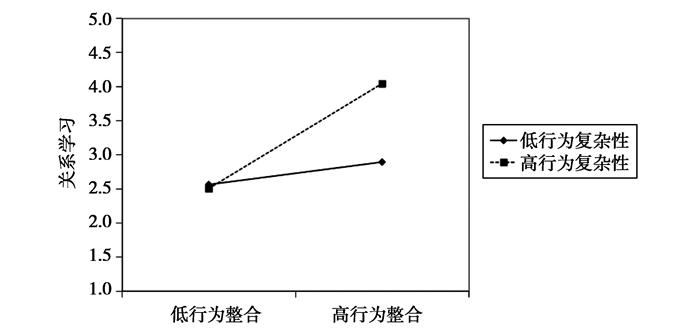 在新企业发展过程中,它们会积极寻求与外部主体建立联系来获取资源和降低风险(Engel et al., 2017),由此,本文提出创业团队行为复杂性将会正向调节关系学习与创业绩效的关系。具体而言,一方面,创业团队行为复杂性所带来的多种行动方案扩大了企业关系搜寻的范围,增强了建立、维护关系的潜力(Wong et al., 2011),从而诱发了与多元化主体合作和学习的契机。在此情况下,企业经由关系学习可实现更高的绩效。另一方面,创业团队行为复杂性提升了企业阐释复杂信息、处理复杂流程的能力(Carmeli and Halevi, 2009),从而使得企业在实施关系学习的过程中能够通过沟通更深入理解彼此的需求和欲望,促进企业间的信任,进而引领合作伙伴进行专有知识和有价值资源的交换以及机密信息的分享(Stephan and Pathak, 2016),促进知识库的拓展,提升创业绩效。故本文提出以下假设: