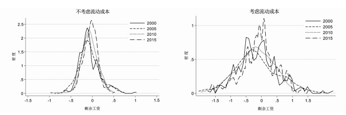 图 1 各城市劳动力剩余工资的核密度图(2000-2015) |