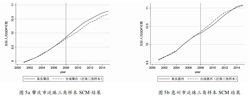 综合两种检验结果,本文有足够证据证明珠三角扩容后对肇庆与惠州市产生显著增长效应,但惠州市在扩容后短期内也确实出现负面效应。因此,区域扩容对新进地区的增长效应在短期中存在差异,但长期中具有显著促进作用。