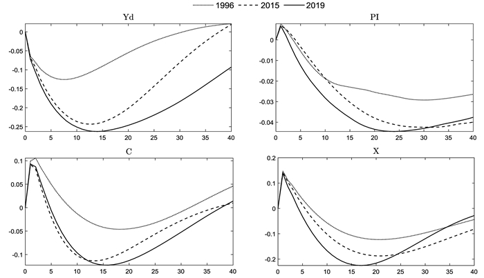 (三) 政策利率传导效率的时变特征分析为方便分析随着利率市场化推进我国政策利率传导效果的变化,本文选择了三个利率市场化的代表性时点进行分析,分别为1996年、2015年和2019年。从我国利率市场化的历史进程来看,主要包括货币市场利率的市场化、信贷市场利率市场化(浮动上下限管制放开)、基准利率和利率传导市场化三个阶段。1993年党中央、国务院提出利率市场化改革的目标和任务之后,1996年我国首次放开银行间同业拆借市场,标志着货币市场利率市场化正式开启,因此1996年可以代表利率市场化水平相对较低的时期。伴随着货币市场利率的改革,信贷市场利率改革同步推进,其核心是逐步放开对存贷款利率浮动的限制,2015年我国将存款利率上限先后调整至基准利率的1.3倍和1.5倍,最终完全放开限制,标志着名义上利率市场化的完成,因此2015年可以代表利率市场化水平较高的时期。为进一步推进利率市场化,中国人民银行于2019年完善了贷款市场报价利率(LPR)的形成机制,将其锚定MLF利率并作为银行贷款利率制定的基准,标志着基准利率和利率传导市场化改革向前迈进一步,因此2019年代表了利率市场化水平更高的发展阶段。本文分别计算了政策利率冲击对实际产出、通货膨胀率、消费、投资在三个代表性时点影响的时变脉冲响应函数(见图 2)。可以看出,一标准差大小的正向利率冲击引致产出、通货膨胀率、消费、投资的下降,表明我国政策利率对四个宏观经济变量均产生了良好的逆周期调控效果,这一结果与DSGE模型的模拟结果相一致,但也存在一定的差异,即政策利率对通货膨胀率、消费和投资的调控存在一定的时滞效应。