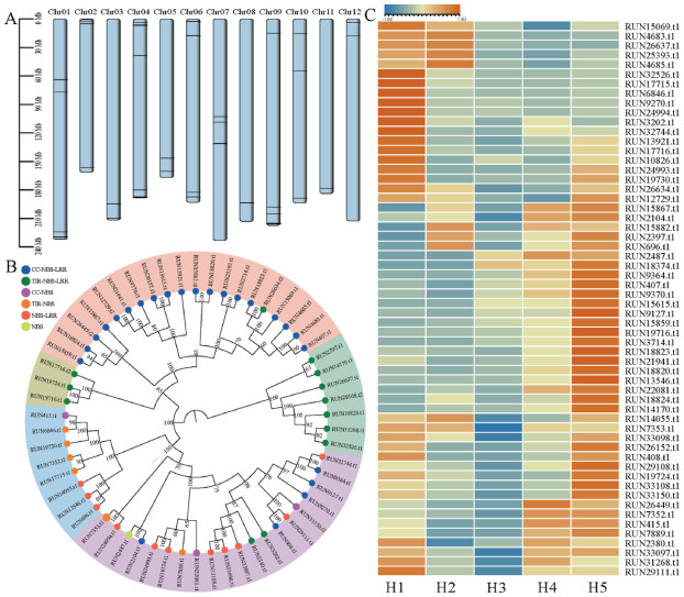 To further understand the phylogenetic relationship of the NBS genes and their expression patterns during fruit development, we constructed a phylogenetic tree and performed DEGs analysis among the H1–H5 fruit samples (Table S16). A total of 58 differentially expressed candidate NBS genes were identified. Phylogenetic analysis showed that these genes are closely related (Fig. 6B) and are distributed in clusters at the ends of chromosomes (Fig. 6A). The expression patterns revealed that more than half of the genes were highly expressed during the H1 and H5 stages (Fig. 6C). This suggests that these genes play an important role in the development of resistance during fruit development.