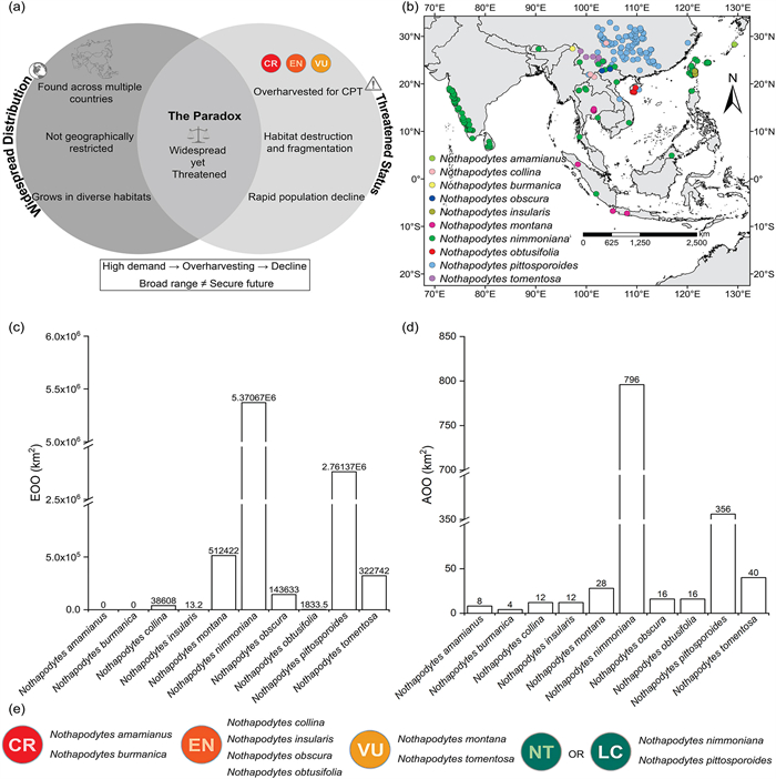 | Fig. 1 The paradox of widespread yet threatened species in the genus Nothapodytes. (a) Conceptual Venn diagram illustrating that, despite their broad distribution across multiple countries and diverse habitats, Nothapodytes species remain threatened due to overharvesting for CPT extraction, habitat destruction, and population decline. (b) Geographic distribution map across Asia (GBIF, 2025). (c) The Extent of Occurrence (EOO). (d) The Area of Occupancy (AOO) for each species. (e) Proposed IUCN Red List categories based on IUCN B1 and/or B2 criteria. |