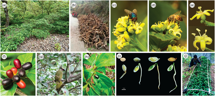| Fig. 2 Reproductive ecology, threats, and conservation of Nothapodytes tomentosa. (a) Natural habitat. (b) Destruction of wild populations due to overharvesting. (c) A fly and (d) a bee visiting male flowers. (e) Female (top) and male (bottom) flowers. (f) Fruits. (g) Seed dispersal by birds. (h) Leaf beetle feeding on leaves. (i) Different stages of seed germination. (j) Local cultivation efforts, showing plantation of young individuals. |
