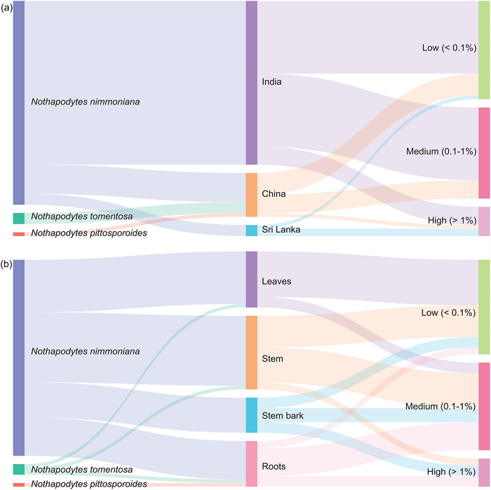 | Fig. 3 Distribution of camptothecin content across different Nothapodytes species, geographical regions, and plant parts. (a) Camptothecin content across different Nothapodytes species (N. nimmoniana, N. tomentosa, and N. pittosporoides) in relation to their geographic origin (India, China, and Sri Lanka), categorized as low (< 0.1%), medium (0.1–1%), and high (> 1%) levels. (b) Variation in camptothecin content among different plant parts (leaves, stem, stem bark, and roots) of Nothapodytes species, categorized as low, medium, and high. The width of the connecting bands represents the relative contribution of each category. |