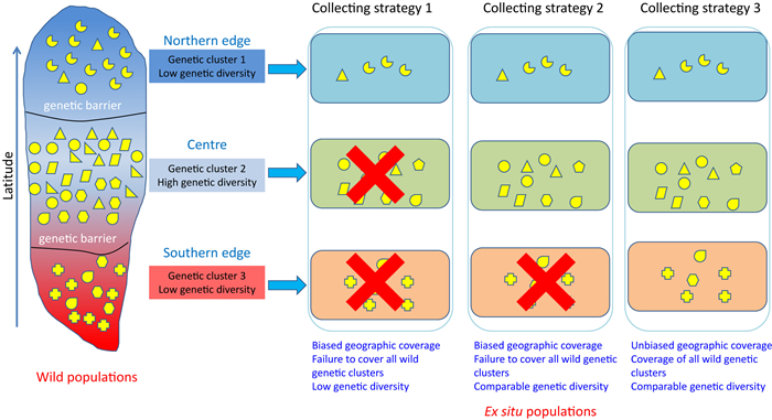 | Fig. 1 Conceptual diagram shows the genetic representativeness in ex situ populations is affected by sampling strategy. Wild populations have uneven distribution of alleles (e.g., different yellow symbols) and their frequencies, uneven distribution of genetic diversity, and range-wide genetic structure across the distribution range of target plant species. Three common sampling strategies are used in ex situ conservation. In sampling strategy 1, the range of plant collection is spatially biased to a northern wild genetic cluster with low genetic diversity; consequently, ex situ populations fail to cover all wild genetic clusters and have lower genetic diversity than wild populations. In sampling strategy 2, the range of plant collection is spatially biased to north and central wild genetic clusters with low and high genetic diversity respectively; in this case, ex situ populations also fail to cover all wild genetic clusters but have comparable genetic diversity as wild populations. In sampling strategy 3, the range of plant collection covers all wild genetic clusters; ex situ populations capture all wild genetic clusters and have comparable genetic diversity as wild populations. In all three collecting strategies, we assume that the collection size is sufficient. |