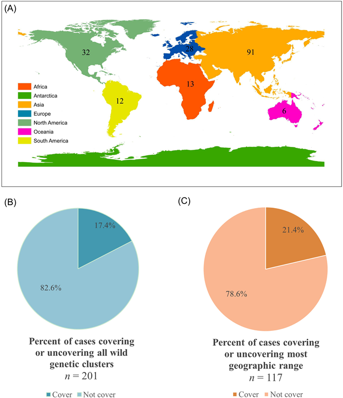 | Fig. 2 (A) Geographic distribution by continents of 201 ex situ conservation case studies. (B) Percentage of case studies that covered all wild genetic clusters and percentage of cases studies that covered most of geographic range. (C) Ex situ conservation genetics of wild plants across the world. Continents with different numbers of cases are shown in different colors. There are 84 cases with no information on geographic coverage. |