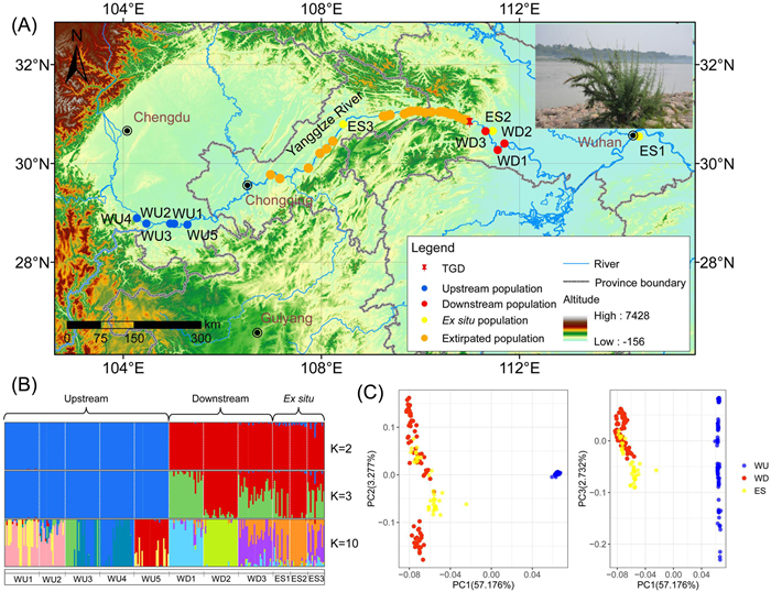 | Fig. 3 Map of the study region showing the locations of the populations (A) and the population genetic structure of Myricaria laxiflora based on ADMIXTURE analysis (B) and PCA (C), including eight remnant wild populations (WU1–WU5, blue circles; WD1–WD3, red circles) and three ex situ populations (yellow circles; ES1–ES3). The upstream and downstream populations are WU1–WU5 and WD1–WD3, respectively. No samples were collected from the dozens of extirpated populations (orange circles) because they were completely submerged after the construction of the Three Gorges Dam. In C–A large span of ex situ collections (yellow dots) does not sort with any wild populations, which may represent the living collections from the submerged populations. |