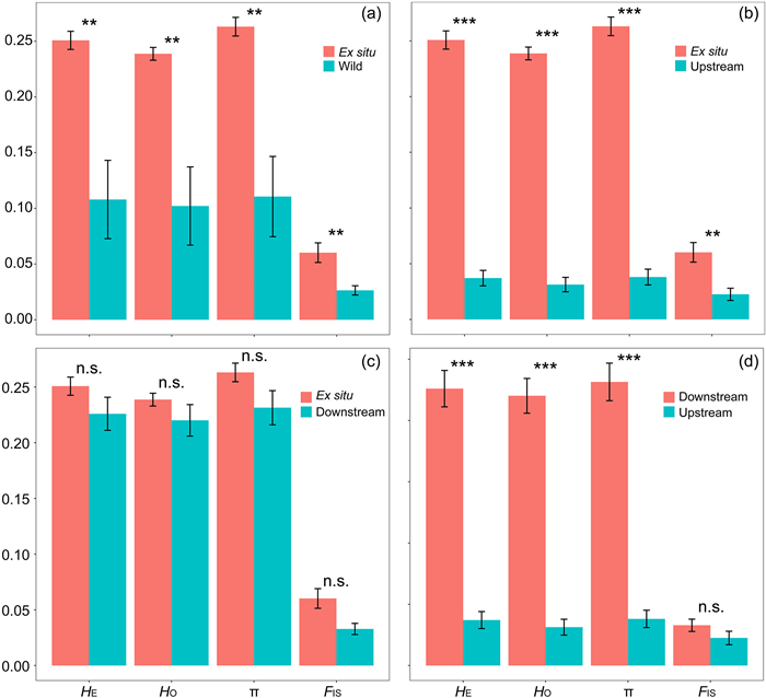 | Fig. 4 Comparison of genetic diversity (HE, Expected heterozygosity; HO, Observed heterozygosity; and π, Nucleotide diversity) and inbreeding coefficient (FIS) between different population groups: (A) ex situ vs. wild (upstream + downstream), (B) ex situ vs. upstream, (C) ex situ vs. downstream, and (D) downstream vs. upstream. |