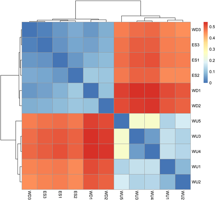 | Fig. 5 Heatmap of pairwise FST values among Myricaria laxiflora populations. Orange indicates a higher degree of genetic differentiation between populations, while blue indicates a lower degree. WU1–WU5, wild upstream; WD1–WD3, wild downstream; and ES1–ES3, ex situ populations. |