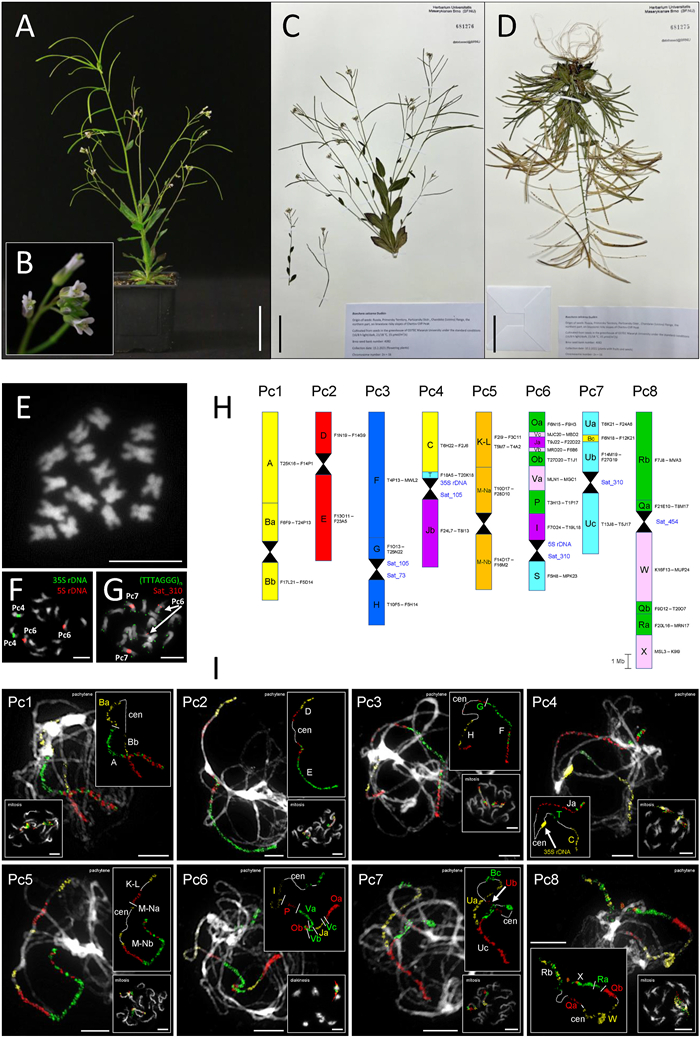 | Fig. 1 Genome structure of Parryodes calcarea. (A) Photograph of cultivated plant. (B) Close-up of inflorescence. (C) Herbarium specimen of flowering plant accession investigated, deposited in the herbarium of Masaryk University (BRNU). (D) Herbarium specimen of plant bearing fruits. (E) Mitotic chromosome spread prepared from a root tip, showing 2n = 16 chromosomes. (F) Mitotic chromosomes hybridized with 35S and 5S rDNA probes. (G) Mitotic chromosomes hybridized with telomeric and centromeric satellite Sat_310 probes. (H) Karyotype structure inferred from comparative chromosome painting (CCP), with the eight individual chromosomes labelled as Pc1–Pc8. Capital letters (A to X) represent the 22 genomic blocks (GBs) of the Ancestral Crucifer Karyotype (ACK; Mandáková et al., 2019), some of which are reshuffled into sub-blocks (e.g., Ba, Bb, Bc). Each GB is color-coded to correspond to its original position on the eight chromosomes of the ACK. Hourglass symbols indicate centromeres, and Arabidopsis BAC clones are provided as markers for each (sub-)block. Chromosomes are drawn to scale (scale bar = 1 Mb). (I) The eight chromosomes (Pc1–Pc8) were visualized through CCP using Arabidopsis BAC contigs as painting probes applied to pachytene, mitotic, and diakinesis chromosome spreads. Painting signals are shown in experimental colors, reflecting the fluorochromes used to label specific GBs. When a GB is labelled with a single fluorochrome, its letter is displayed in the corresponding color. For subdivided GBs labelled with multiple fluorescent dyes to indicate their orientation, the letters are shown in white. Centromeres are marked as "cen". All chromosomes were counterstained with DAPI. Scale bars are 5 cm for plant photographs (A, C, D) and 10 μm for chromosome images (E, F, G, I). |