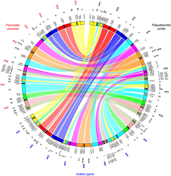 | Fig. 3 Comparative chromosome structure of Parryodes calcarea. A Circos diagram illustrating chromosomal collinearity between Pseudoturritis turrita (Mandáková et al., 2020b), Arabis cypria (Mandáková et al., 2020b), and P. calcarea. Chromosomes are color-coded, with capital letters (A to X) corresponding to the eight chromosomes and 22 genome blocks (GBs) of the Ancestral Crucifer Karyotype (ACK; Mandáková et al., 2019). Black blocks represent centromeres, while grey blocks denote the locations of 35S and 5S rDNA loci. Arabidopsis BAC clones are used as markers for each (sub-)block, enabling determination of collinearity between genomes. |
