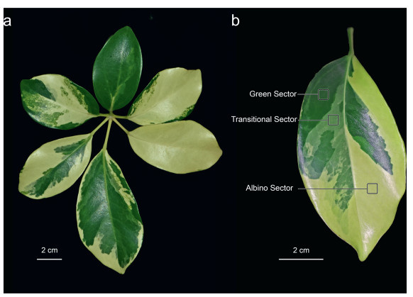 | Fig. 1 Leaf variegation in Heptapleurum ellipticum. (a) The distributions of albino sectors in leaflets of a compound leaf. (b) Green, transitional and albino sectors in a leaflet. |