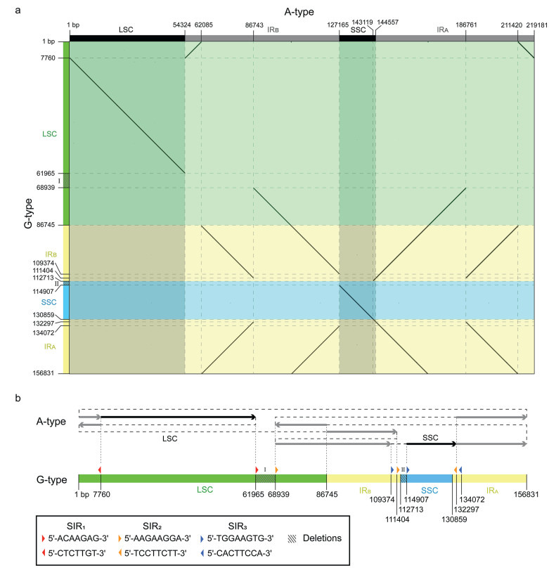 | Fig. 2 Comparison of A- and G-type plastomes in Heptapleurum ellipticum. (a) Dot plot comparison of the G- and A-type plastomes. (b) A schematic diagram of the A- and G-type plastomes. Horizontal arrows indicate the components of the A-type plastome, relative to those of the G-type plastome, with black and grey arrows representing single-copy regions (LSC and SSC) and two-copy regions (IRs) of the A-type plastome, respectively. Different parts of the A-type plastome are connected by the dashed lines. Two deletions (Ⅰ and Ⅱ) occurring in the A-type plastome correspond to dashed areas in the G-type plastome. Two triangles with the same color and direction represent a pair of small direct repeats, while those with the same color but opposite directions represent a pair of small inverted repeats (SIR). Sequences of small inverted repeats are shown at bottom. Nucleotide positions of region junctions and three pairs of small repeats are indicated in the G-type plastome. |