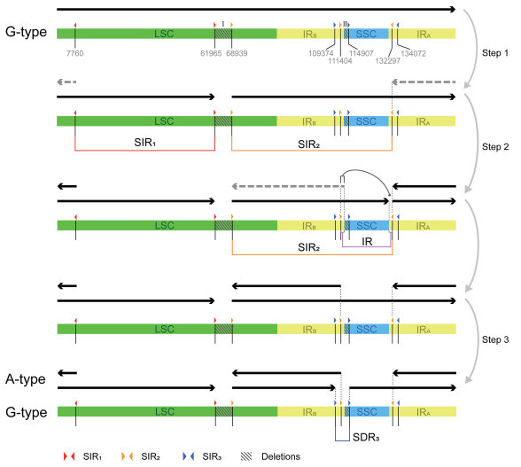 As shown in Fig. 3, the formation of the A-type plastome can be completed by three steps. First, recombination mediated by SIR1 and SIR2 generates a molecule containing a deletion (deletion Ⅰ) at nucleotide positions 61, 965–18, 939, and a duplication at nucleotide positions 132, 297–156, 831-1-7, 759 (recombination mode shown in Fig. S4d). Second, recombination mediated by SIR2 and IR generates a molecule containing a deletion at nucleotide positions 130, 859–132, 297 and a duplication at nucleotide positions 68, 939–112, 713 (recombination mode shown in Fig. S4d). Given the nature of inverted repeats, we then move the sequence at the nucleotide positions 111, 404–112, 713 in the IRB to fill the gap at nucleotide positions 130, 859–132, 297 in the IRA. Third, recombination mediated by SDR3 produces a deletion (deletion Ⅱ) at nucleotide positions 109, 374–114, 907 (recombination mode shown in Fig. S4b). Other intermediate products are generated during these steps, but they are not likely able to survive because of large-scale deletions. The process of the formation of the A-type plastome is also shown in Fig. S6, in a circular manner. Note that the above steps could occur in any order and the resulting recombinants are the same. In addition, there are other possible scenarios that can generate the A-type plastome by inter- and intra-molecular recombination mediated by these repeats, and some of them were shown in Fig. S7.