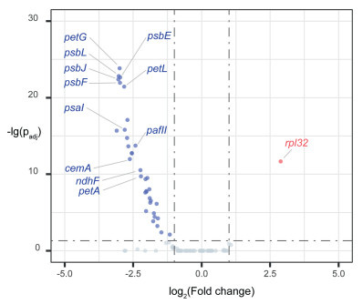 | Fig. 4 A volcano plot showing differentially expressed plastid genes between albino and green sectors of Heptapleurum ellipticum. The horizontal and vertical dash-dotted lines marked the significance level at 0.05 and the fold-changes greater than 2. Blue and red bullets denote significantly down- and up-regulated genes in albino sectors relative to green sectors, respectively, and grey bullets denote genes without a significant change in expression. |